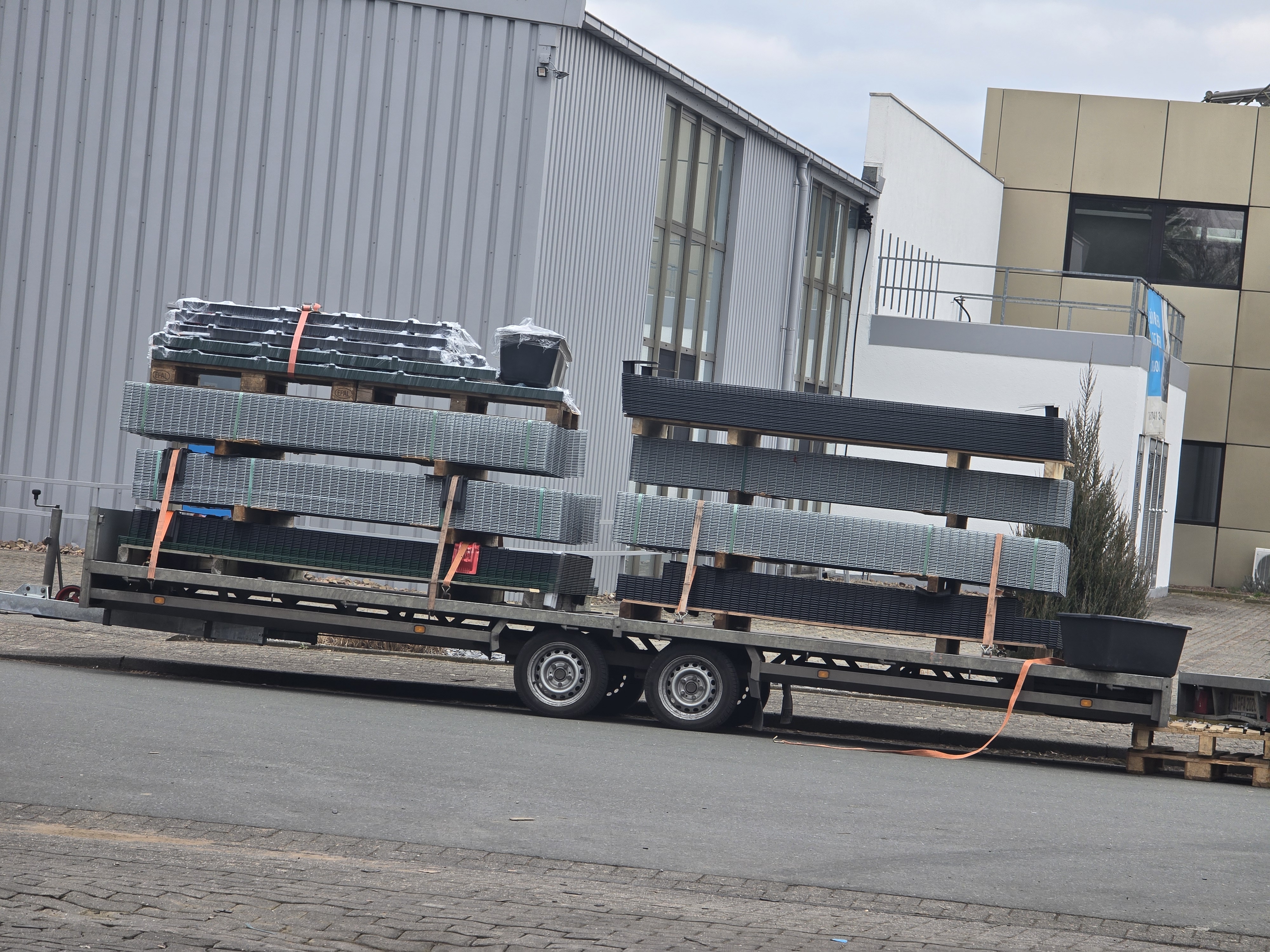 Maximale Flexibilität für jede Adresse: Im Gegensatz zu vielen anderen Anbietern liefern wir unsere Doppelstabmatten nicht mit schweren 40-Tonnen-Sattelzügen aus. Wir nutzen kleine LKW/Transporter mit Anhänger.